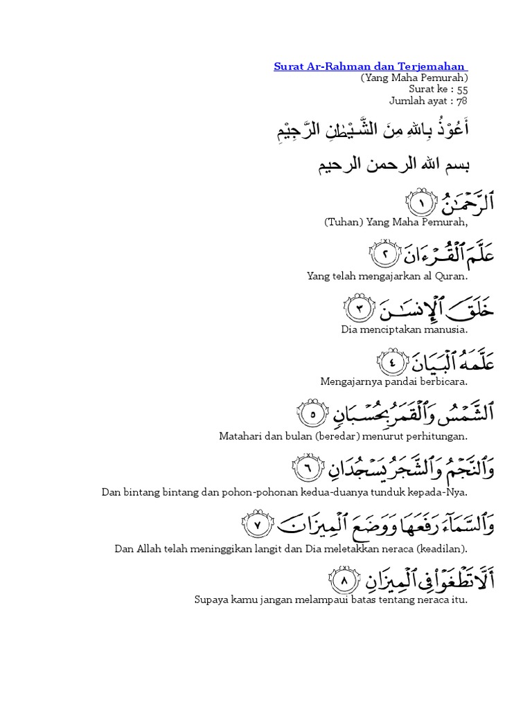 Surah Ar Rahman Dan Terjemahan / Dan tegakkanlah keseimbangan itu dengan adil dan janganlah kamu mengurangi keseimbangan itu.. Jadi, pelajaran pentingnya adalah kekuasaan dan iman. Dan menerangkan tentang pembalasan diakhirat, keadaan penghuni neraka dan penghuni syurga. Baca surat ar rahman lengkap bacaan arab, latin & terjemah indonesia. Surah ini tergolong surat makkiyah, terdiri atas 78 ayat. Tanpa iman kekuasaan akan melenceng dari sifat asalanya yaitu melindungi dan mengayomi.