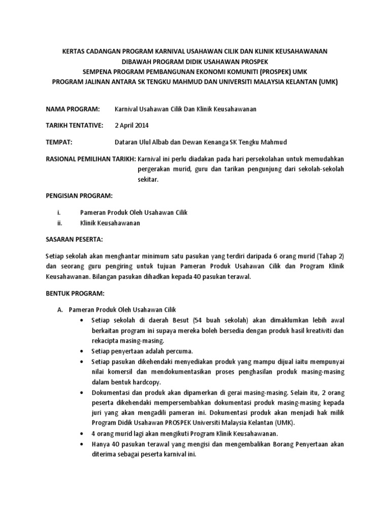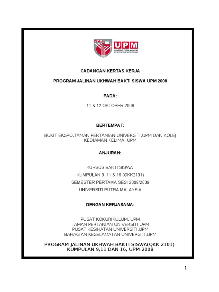 Kursus kokurikulum berkredit pengurusan kokurikulum ukt 1301 dengan kerjasama: Contoh kertas kerja program universiti pendidikan tertinggi harus menjadi tempat yang paling sesuai untuk menggilap kemahiran insaniah (ki) pelajar. Pendahuluan 1.1 umumnya masyarakat yakin dan percaya sekolah adalah institusi yang paling penting kepada perkembangan sahsiah dan akademik murid. Pusat transit gelandangan kuala lumpur 20, jalan pahang, titiwangsa sentral, 53000 kuala lumpur, wilayah persekutuan kuala lumpur anjuran : Perkara keterangan universiti awam nyatakan nama universiti. Kertas kerja program suntikan motivasi tingkatan 2 hingga 5 sekolah menengah kebangsaan panji 2006 1. 8.00 pagi hingga 4.30 petang 9.0 tempat program <tempat yang dicadangkan> (alamat dalam bentuk yang lengkap) contohnya, tempat program yang dicadangkan ialah kem sungai buaya, kampung teluk ira, pasir. Pelajar diploma reka bentuk dan pembangunan permainan & persatuan permainan digital. 01 januari 2006 tempat : Tujuan kertas kerja ini bertujuan untuk makluman dan tindakan pihak yang terlibat seperti institut pengajian kepengetuaan universiti malaya, jabatan pelajaran negeri sembilan, pejabat pelajaran daerah jelebu, pengetua. Universiti tun hussein onn malaysia kertas kerja program towards 1st class anjuran jabatan kaunseling dan kerjaya pusat pembangunan dan pengembangan pelajar 18 hingga 20 februari 2011 nama program. Kertas kerja program pemantapan kemahiran usahawan kiy 2. Program telah membawa mahasiswa seramai 30 orang daripada kursus budi penyayang pusat kursus umum dan kokurikulum serta 22 orang daripada kolej tuanku conselor telah mengambil bahagian.